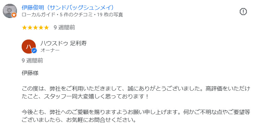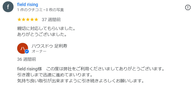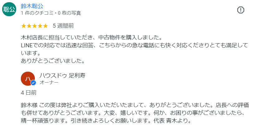 Tanabe様、LINEでの評価大変うれしいです。ビジネスでLINEはどうかと思うとのご意見もありまして、サービスを継続しようか考えておりました。喜んでいただけるお客様がいらっしゃって継続していこうと思いました。売却に向けて、売主様の不安を全力でサポートしていきたいと思います。まだまだ未熟な私どもではございますが、フットワークと情熱をかっていただけたらと存じます。このたびはご縁をくださいまして誠にありがとうございます。